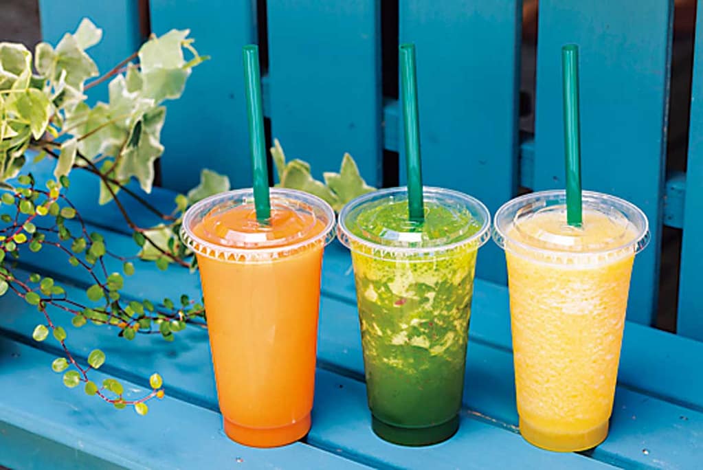 緑豊かなテラスで、種類豊富なスムージー(560円~)をぜひ味わって!