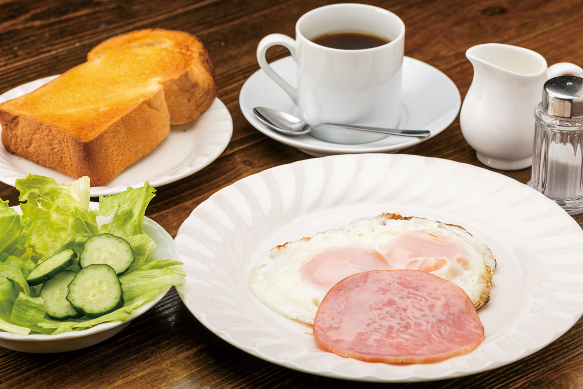 人気のモーニングセット。ハムエッグはシンプルに塩コショウで味わって!