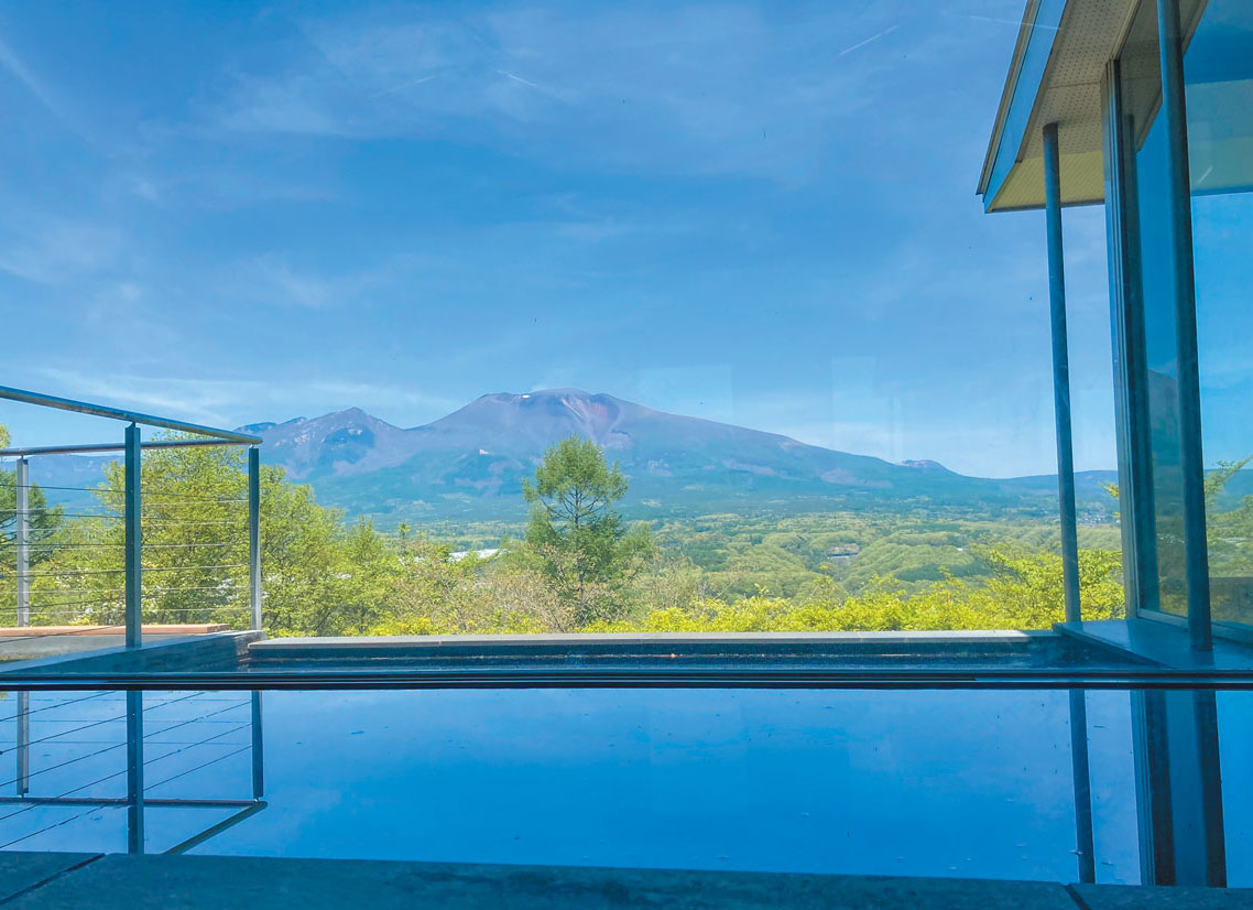 軽井沢駅から車約20分の森の中に佇む「軽井沢天空ホテル&リゾート」は、心地よい静寂と豊かな緑に包まれた隠れ家的な雰囲気が魅力。館内には「浅間天空の湯」があり、四季折々に表情を変える浅間山を眺めながら、敷地内から湧き出る天然温泉(加温・循環ろ過式)で寛ぐことができます。