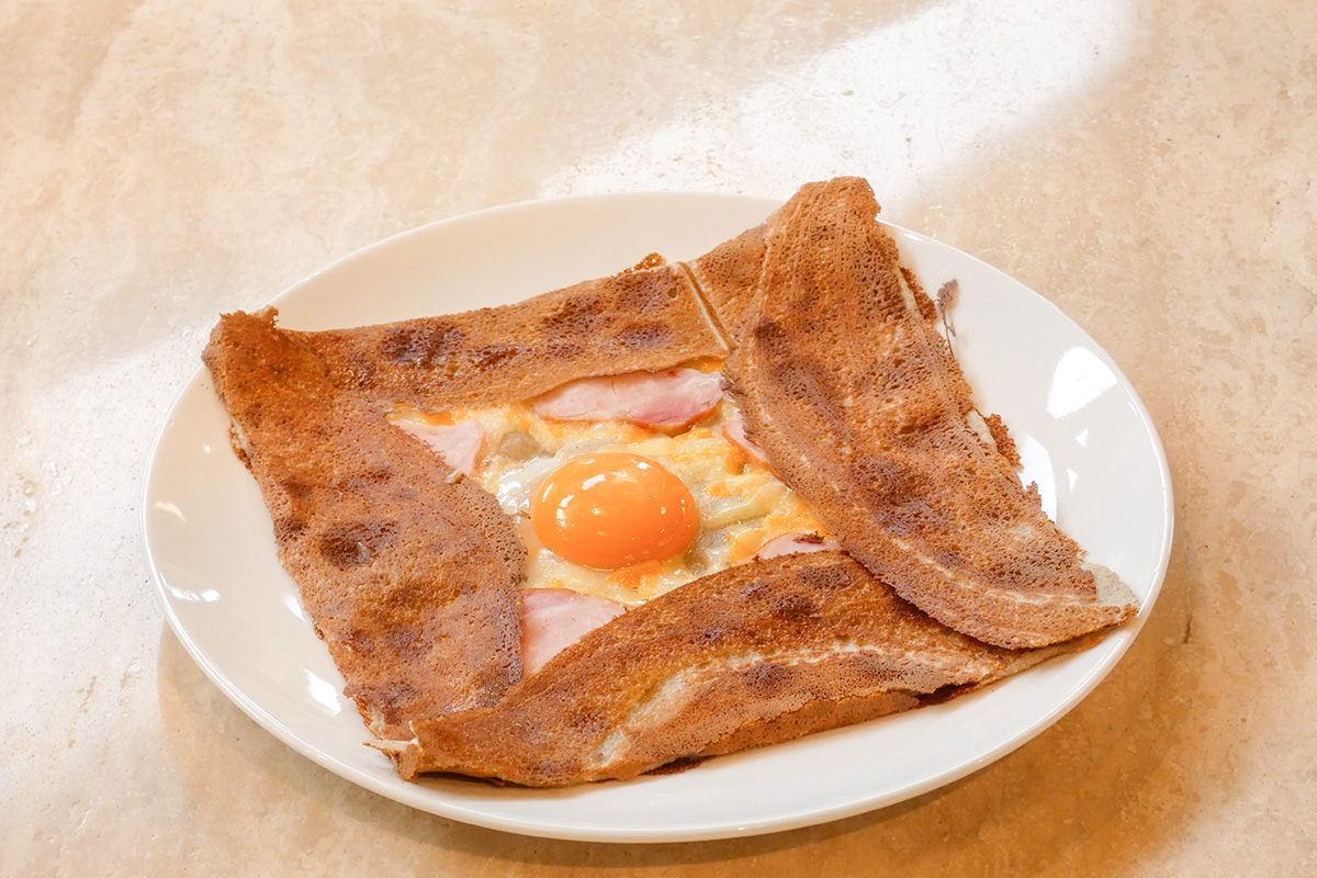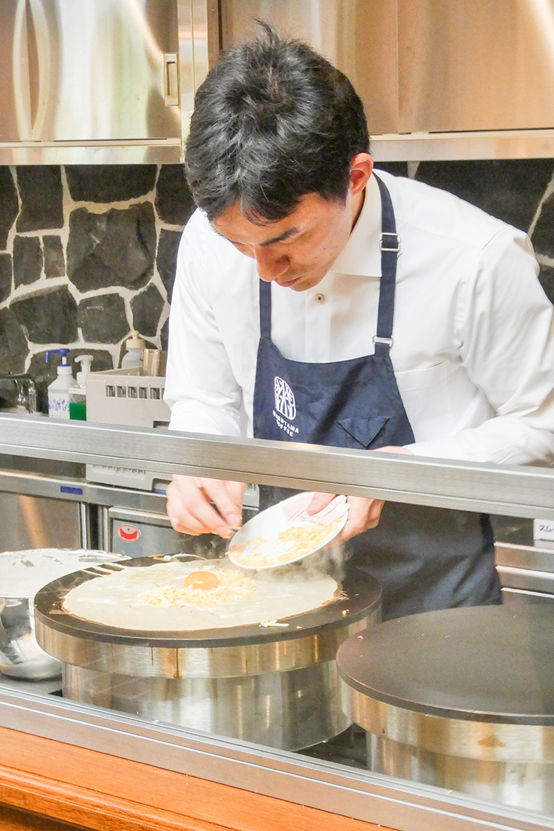 中でもガレットは本場の味をなるべく再現するためにブルターニュ地方へ実際に足を運び研究を重ねた本格派。注文を受けてから1枚1枚高温の鉄板で表面はパリッと、中はもっちりとした食感に焼き上げ、そば粉の風味を存分に楽しめるここでしか味わえない逸品。