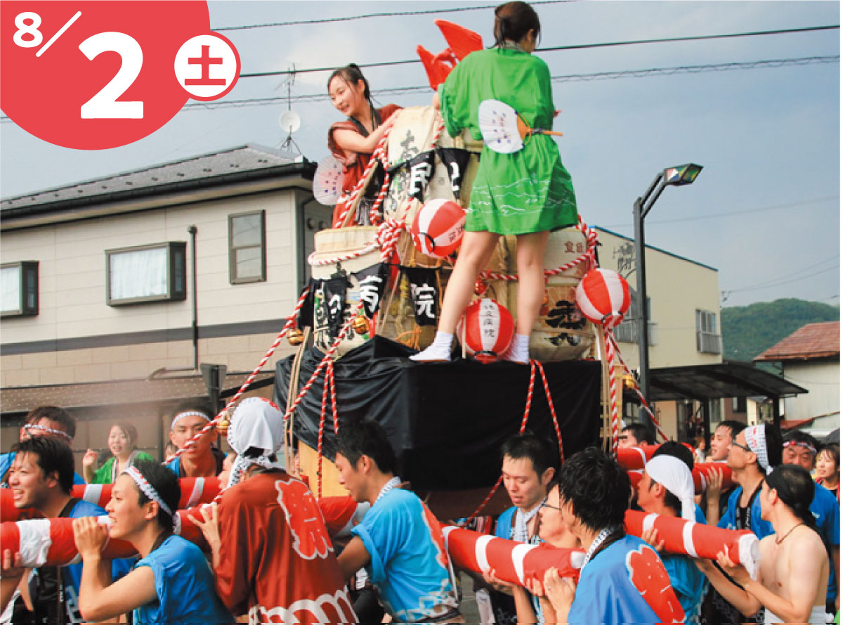 臼田駅から臼田橋下のお祭り広場まで、舞踊流し、大人神輿、子ども神輿が街を練り歩きます!また夜は臼田橋下流での花火打ち上げもあります。