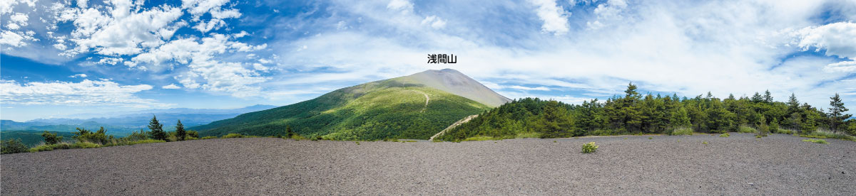 ⑥山頂/小浅間山の頂上は比較的草木が少ない火山礫ですが、眺望は抜群!目の前に迫るダイナミックな浅間山や裾野のカラマツ林、浅間隠山、妙義山など四方の景観が楽しめます