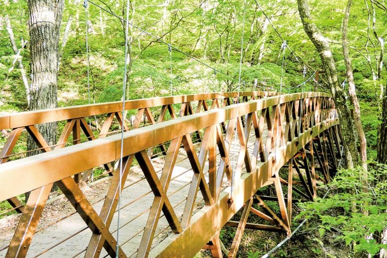「二手橋」は、江戸時代軽井沢宿に泊まった旅人が、知人や旅籠従業員との別れを惜しみ手を振りながら東西二手に別れたことからその名がついたと言われる場所。橋を渡った少し先の右側に「旧碓氷峠遊覧歩道」の入口があり、緑のトンネルからふり注ぐ木漏れ日を浴びながら進みます。雑木林を沢に沿って歩いていくと見えてくるのが木の吊り橋。