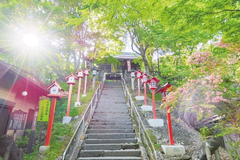 石畳をくだり、車道を北へ進むと、日本武尊の創建と言われる由緒正しい古社「熊野皇大神社」へ。本宮が長野県と群馬県にまたがる全国的にも珍しい神社で、長野県側が「熊野皇大神社」、群馬県側が「熊野神社」になっています。