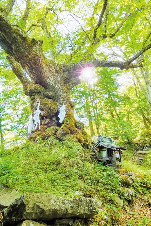 お社の中央で長野県と群馬県にわかれた神社。境内にはパワースポットとして知られる「科の木(御神木)」があります