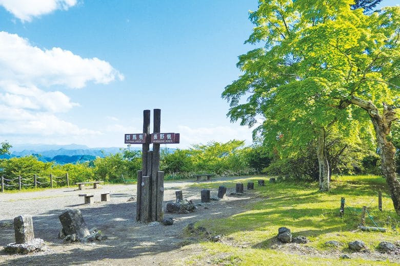 橋の先に続く細い山道を進み、三度山林道を歩道橋で渡ったら尾根に沿ってゆるやかに登ります。遊覧歩道の先に現れる石畳を進むと「見晴台」に到着。長野県と群馬県の県境に位置し、雄大な浅間山や妙義・赤城・榛名の上毛三山の大パノラマが広がる絶景スポットを楽しみながらひと休みしましょう。