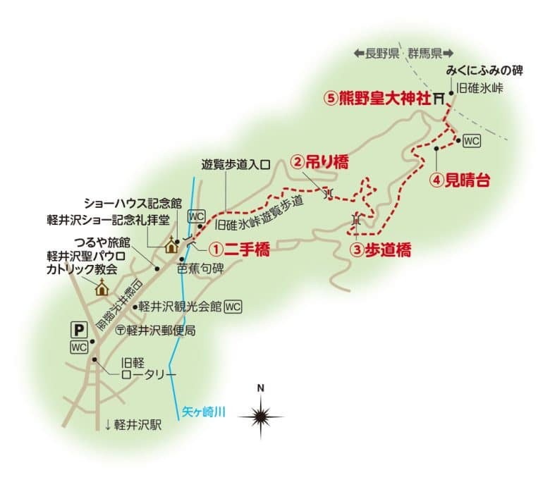 今回は旧軽ロータリーから旧軽井沢銀座を北東へ抜けた先にある「二手橋」から「熊野皇大神社」まで、高原の風を感じながら緑豊かな木立の中をゆっくり散策していきます。